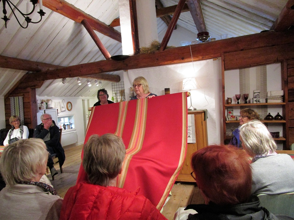 Efter lunchen gick turen vidare till Björke Vävstuga. På slingriga småvägar med mycket vacker natur tog bussen oss till vårt nästa stopp. Väl framme så möttes vi av väveriets två ägarinnor som presenterade sitt företag med 5 anställda. Vi blev förevisade många vackra löpare, dukar stora som små samt handdukar. En presentation med mycket humor från vår guide gjorde att det kom många glada skratt från oss besökare. I väveriet kunde man också se hur man idag väver med mekaniska skyttelvävstolar. Ett butiksbesök och eftermiddagskaffe i väveriets kaffestuga fick avsluta vår hantverksdag. Efter drygt 2 timmar i bussen var vi åter i Västerås.