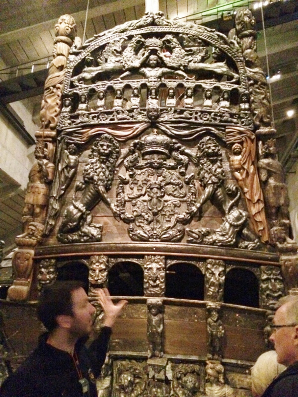 Eftermiddagen avslutades med ett intressant besök på Vasamuseet där vi även intog vår lunch. Bilderna visar dels en modell av Vasa (som tog tre år att förfärdiga) framför originalet (som tog två år), dels den gigantiska akterspegeln.