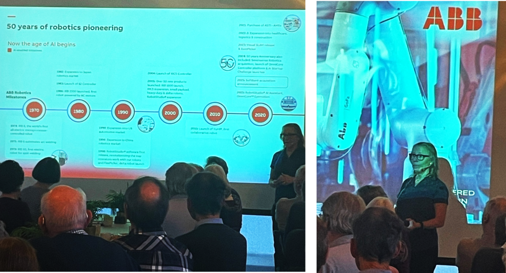 Vi fick en initierad och rolig dragning av kvalitetschefen på ABB Robotics Marie-Louise Stridh. Allt ifrån starten inom ASEA för 50 år sedan, på 70-talet, till framtiden inom Softbank Group som går in som ny ägare under 2026. Arbetet med separationen från ABB med allt var det innebär av nya system, nya arbetssätt och ny kultur har påbörjats och förväntas pågå i upp till 3 år innan man kan släppa kopplingen  till ABB helt.